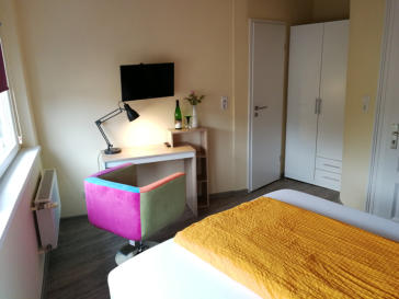 (WiFi) sowie einem Schreibtisch mit einem gemütlichen Sessel. Das Zimmer ist