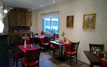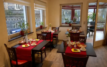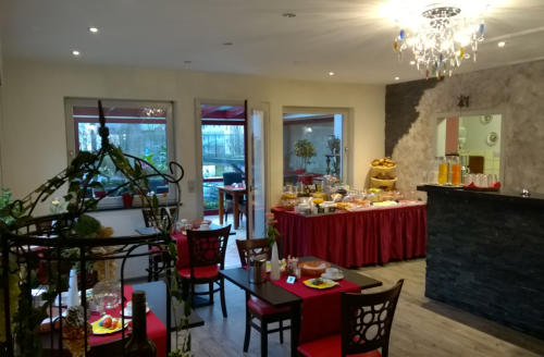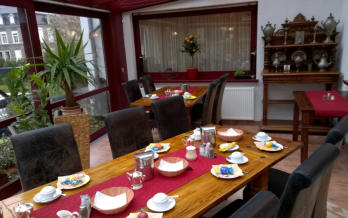 frühstücken in einem modern gestalteten Frühstücksraum, mit angrenzendem mediterranem Wintergarten. Nachmittags können Sie unseren
