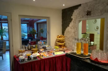 Morgens bedienen Sie sich am herzhaften Frühstücksbuffet. Dazu gibt es frisch aufgebrühten Filterkaffee und verschiedenen Teesorten. Sie